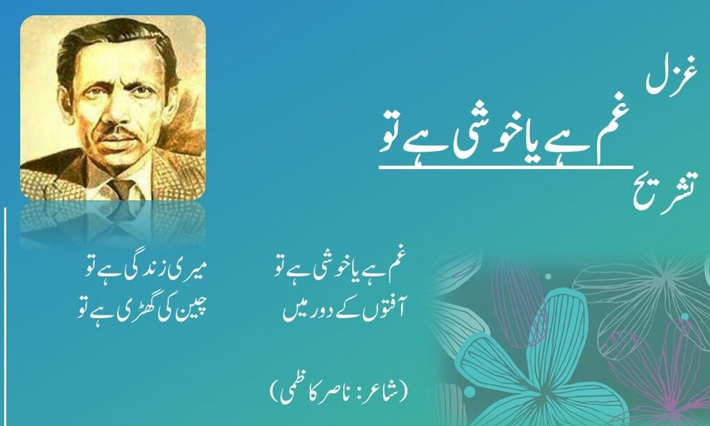 ناصر کاظمی کی یہ غزل میں محبت، وفا، اور زندگی کی پیچیدگیاں بیان کی گئی ہیں۔ یہ غزل ایک گہرے اور پیچیدہ جذبات کی عکاسی کرتی ہے، جس میں شاعر اپنی زندگی کی مختلف کیفیتوں کو بیان کرتا ہے۔ اس غزل کے ہر شعر میں شاعر کی تنہائی، تلاش اور وہ لمحے ہیں جب محبت یا خوشی کی کمی محسوس ہوتی ہے، اور پھر وہ پیار یا محبت کی موجودگی کو اپنے زندگی کی سب سے بڑی حقیقت کے طور پر مانتا ہے۔غزل غم ہے یا خوشی ہے تو تشریح ۔ ناصر کاظمی