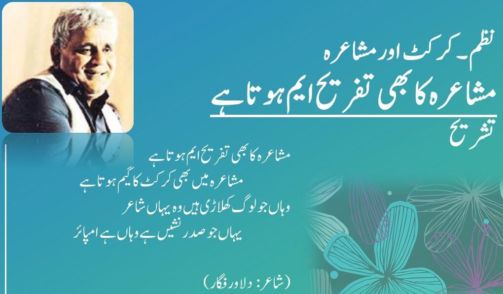 نظم کرکٹ اور مشاعرہ کے اس تشریح طلب شعر میں شاعردلاور فگار  نے کرکٹ کے کھلاڑیوں اور مشاعرہ کے شاعروں کا  موازنہ کیا ہے۔ دلاور فگار کے مطابق کرکٹ میں کھلاڑی کھیل کے میدان میں کھیلتے ہیں، جبکہ مشاعرے میں شاعر کلام کے ذریعے اپنے خیالات پیش کرتے ہیں۔ کرکٹ کے کھلاڑی میدان میں اپنا ہنر ظاہر کرتےہیں جبکہ مشاعرے میں شاعر اپنا ہنر آزماتے ہیں۔ اسی طرح، کرکٹ میں جو امپائر کھیل کو دیکھتا ہے اور فیصلے کرتا ہے، جبکہ مشاعرے میں صدر نشیں وہی کردار ادا کرتا ہے، جو نظم یا غزل کے معیار پر فیصلہ کرتا ہے۔