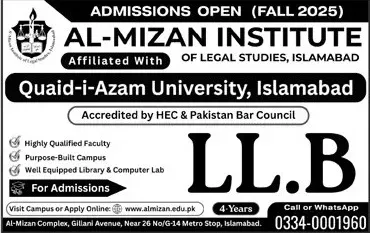The Al-Meezan Institute Of Legal Studies (AILS) Islamabad has announced admissions for the 2025 academic session. Aspiring students can now apply for undergraduate programs, including a highly sought-after LLB degree in Law. This opportunity is ideal for candidates looking to build a strong foundation in legal studies. Read on to learn about offered programs, last date to apply, how to apply, and the official advertisement.