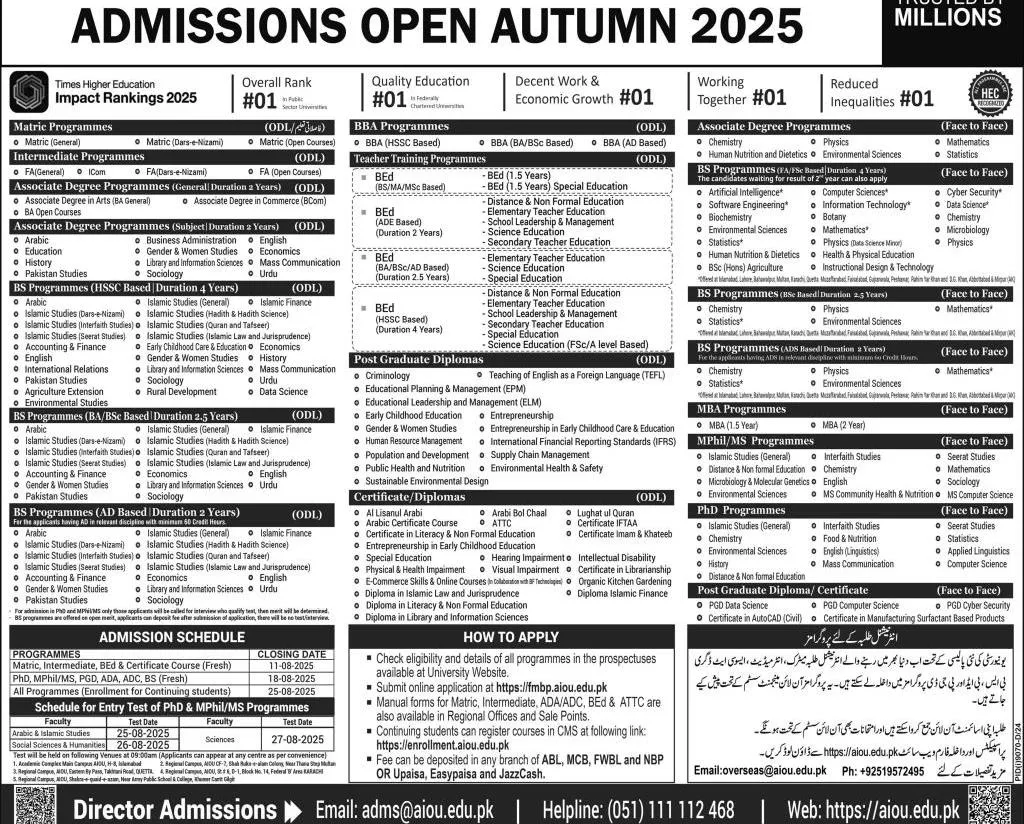 For further queries, visit AIOU’s official website or contact the admission helpline. Don’t miss this opportunity to enroll in one of Pakistan’s most reputed open universities!