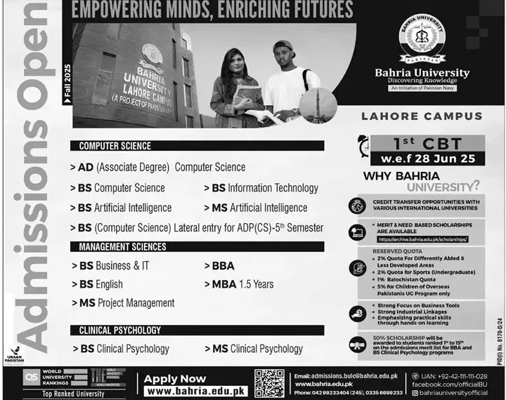 For detailed eligibility criteria and admission guidelines, refer to the official advertisement below or contact the Bahria University Lahore Admissions Office.