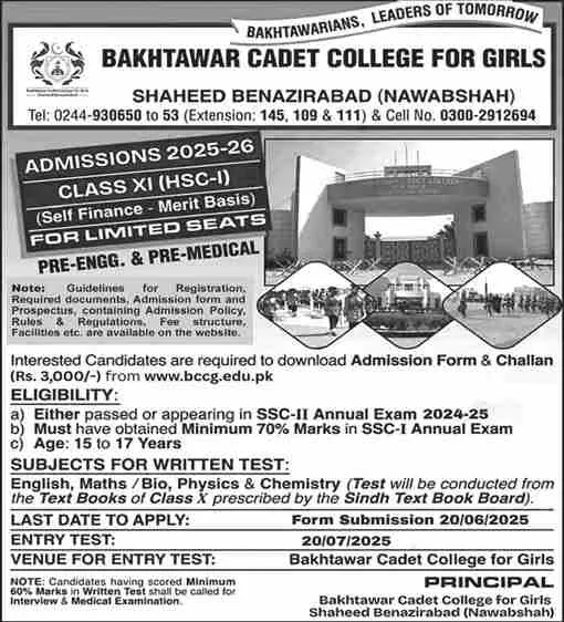 📌 View Bakhtawar Cadet College for Girls (BCCG) Nawab Shah Admission 2025 Advertisement