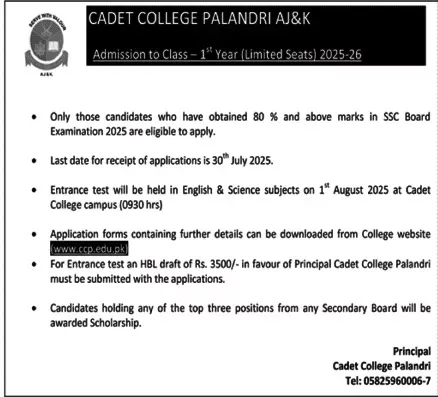 For complete details on Cadet College Pallandri Admission 2025, refer to the official advertisement below: