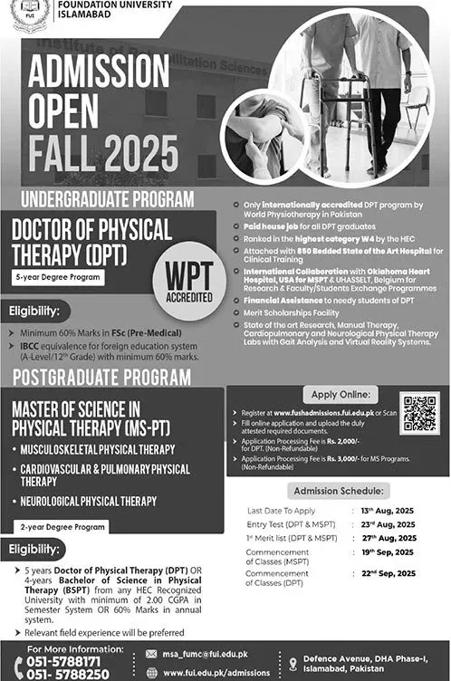 Foundation University Islamabad (FUI) has officially announced admissions for the 2025 academic session. Aspiring students can now apply for various undergraduate degree programs, including Bachelor of Science (BS) and Doctor of Physical Therapy (DPT). If you’re planning to join FUI for your higher education, here’s everything you need to know about the admission process, eligibility, and deadlines.