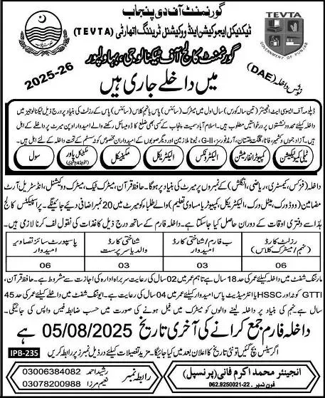 The last date to apply for Government College of Technology Bahawalpur Admission 2025 is:
