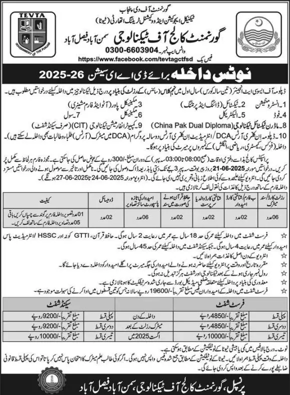 Government College of Technology Samanabad is a leading institution for technical education, offering career-focused DAE and Diploma programs. If you meet the eligibility criteria, ensure you submit your application before June 21, 2025, to secure your admission.