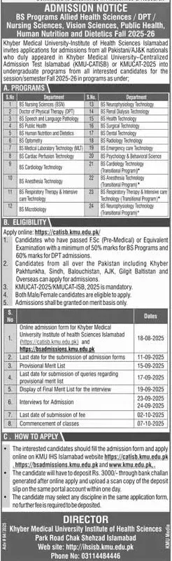 For complete information regarding admission requirements, fee structure, and contact details, check the official advertisement issued by Institute of Health Sciences Islamabad: