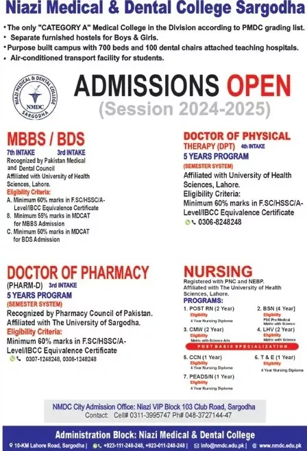 Niazi Medical And Dental College (NMC) Sargodha Admissions 2025 – Programs & How to Apply