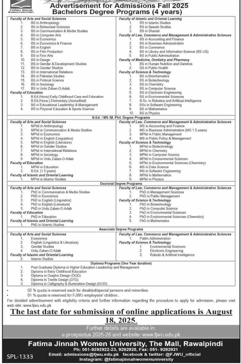 Fatima Jinnah Women University (FJWU) Admission 2025 for BS Programs Introduction Fatima Jinnah Women University (FJWU), Rawalpindi, has officially announced admissions for the 2025 academic session. Aspiring female students can now apply for a wide range of undergraduate programs. FJWU is renowned for providing quality education and fostering leadership skills among women, making it a
