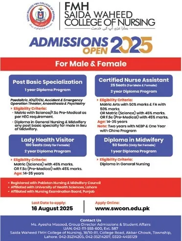 Saida Waheed FMH College of Nursing (SWFMHCN) Admission 2025: Diploma & Certificate Programs Are you looking to pursue a career in nursing? Saida Waheed FMH College of Nursing (SWFMHCN) Lahore has opened admissions for 2025 for various Diploma and Certificate programs. This is an excellent opportunity for aspiring healthcare professionals to gain specialized training in