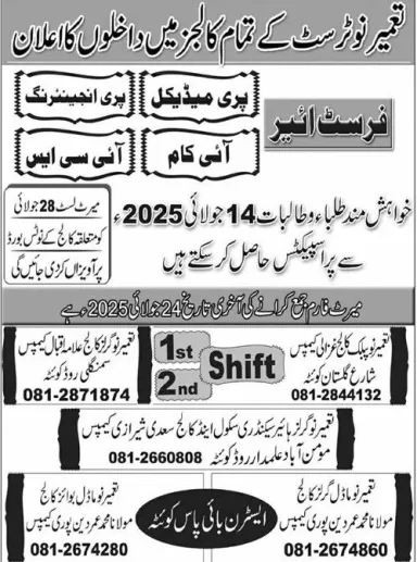 Tameer-e-nau Public College ( TNPC) admission 2025 for INTERMEDIATE / A-LEVEL Courses / Degrees