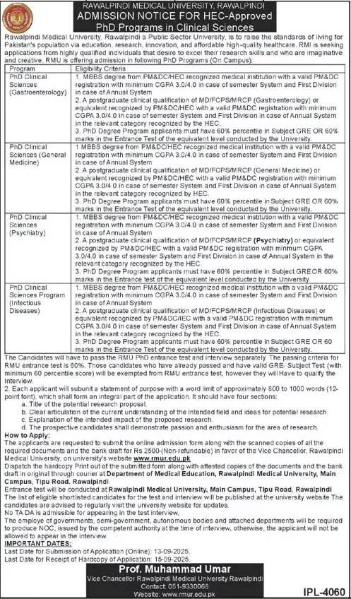 Don’t miss this opportunity to advance your medical career with a Ph.D. degree from Rawalpindi Medical University (RMU). Apply now and take the next step in your academic journey!