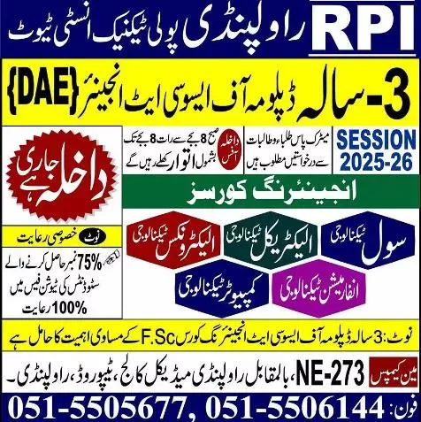 Are you looking for a promising career path right after matriculation? Rawalpindi Polytechnic Institute (RPIT) has announced admissions for Diploma of Associate Engineering (DAE) and Certificate programs for the 2025 academic session. These technical courses are designed to equip students with industry-relevant skills for a successful career in various engineering fields.