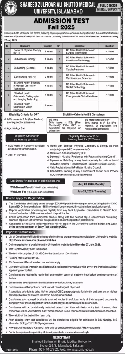 Shaheed Zulfiqar Ali Bhutto Medical University, Pims ( SZABMU) admission 2025 for BS Courses / Degrees