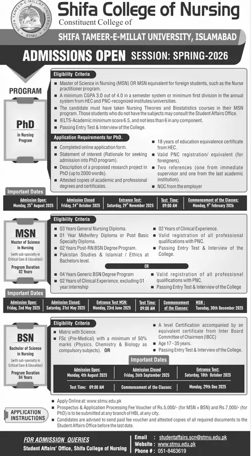 - Visit the official website of Shifa College of Nursing for detailed admission guidelines.