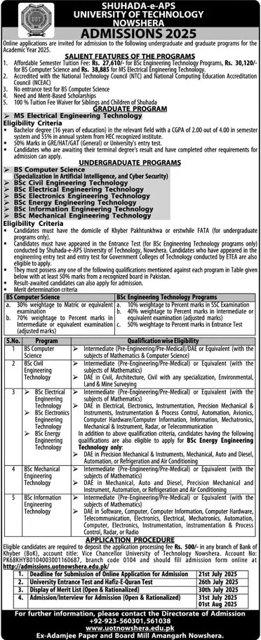 Are you looking to pursue a Bachelor’s degree in technology and engineering fields? The University of Technology, Nowshera (UOT), has officially opened admissions for the 2025 academic session. With a range of cutting-edge undergraduate programs, UOT provides excellent opportunities for students to build a strong foundation in technical education.
